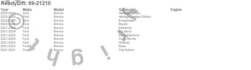 Brand: ReadyLiftPart Number: 69-21210Lift Kit-Suspension Type: 2 in. Front/2.5 in. Rear LiftUPC: 194933199105