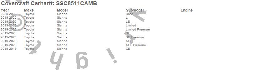 Below is an abbreviated list of applications for the Covercraft Carhartt SeatSaver.Sienna, Toyota, 2020, 2019