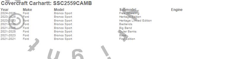 Below is an abbreviated list of applications for the Covercraft Carhartt SeatSaver.Bronco Sport, Ford, 2025, 2024, 2023, 2022, 2021