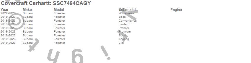 Below is an abbreviated list of applications for the Covercraft Carhartt SeatSaver.Forester, Subaru, 2025, 2024, 2023, 2022, 2021, 2020, 2019