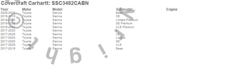 Below is an abbreviated list of applications for the Covercraft Carhartt SeatSaver.Sienna, Toyota, 2020, 2019, 2018, 2017