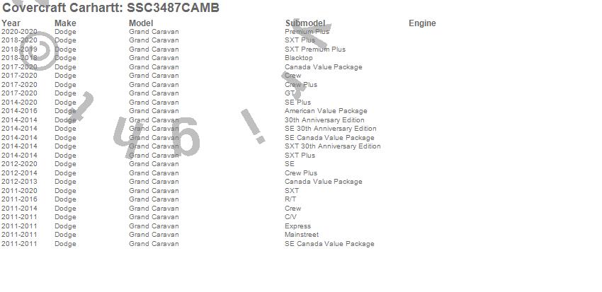 Below is an abbreviated list of applications for the Covercraft Carhartt SeatSaver.Grand Caravan, Dodge, 2020, 2019, 2018, 2017, 2016, 2015, 2014, 2013, 2012, 2011