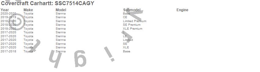 Below is an abbreviated list of applications for the Covercraft Carhartt SeatSaver.Sienna, Toyota, 2020, 2019, 2018, 2017