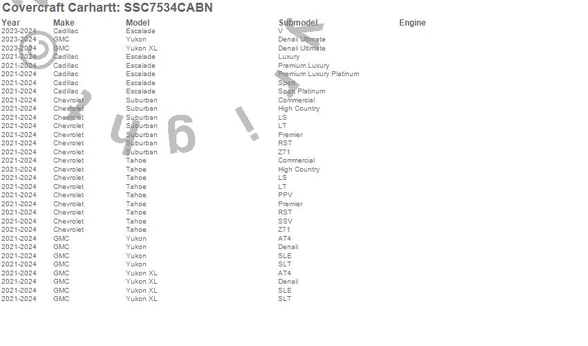 Below is an abbreviated list of applications for the Covercraft Carhartt SeatSaver.Escalade, Escalade ESV, Suburban, Tahoe, Yukon, Yukon XL, Cadillac, Chevrolet, GMC, 2026, 2025, 2024, 2023, 2022, 2021