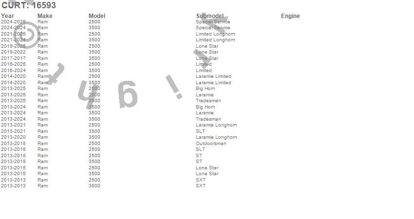 Brand: CURTPart Number: 16593Fifth Wheel Trailer Hitch Type: 30000 lbs. Gross Trailer Weight - 5th Wheel HitchUPC: 612314052394