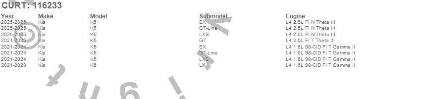 Below is an abbreviated list of applications for the Class I 1.25 in. Receiver Hitch.K5, Kia, 2025, 2024, 2023, 2022, 2021