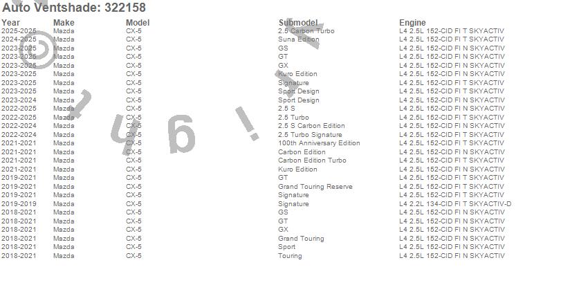Below is an abbreviated list of applications for the Aeroskin Smoke Hood Protector.CX-5, Mazda, 2025, 2024, 2023, 2022, 2021, 2020, 2019, 2018
