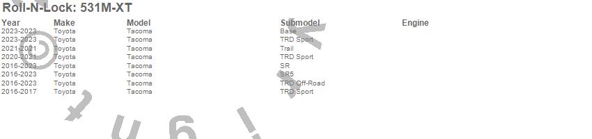 Below is an abbreviated list of applications for the Roll-N-Lock M-Series XT Truck Bed Cover.Tacoma, Toyota, 2023, 2022, 2021, 2020, 2019, 2018, 2017, 2016