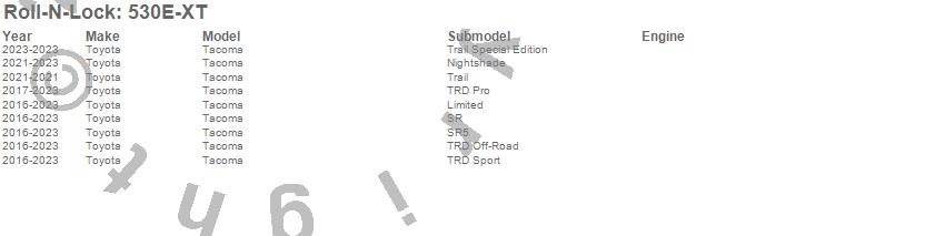 Below is an abbreviated list of applications for the Roll-N-Lock E-Series XT Tonneau Cover.Tacoma, Toyota, 2023, 2022, 2021, 2020, 2019, 2018, 2017, 2016