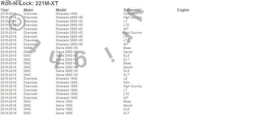 Below is an abbreviated list of applications for the Roll-N-Lock M-Series XT Truck Bed Cover.Sierra 1500, Sierra 2500 HD, Sierra 3500 HD, Silverado 1500, Silverado 2500 HD, Silverado 3500 HD, Chevrolet, GMC, 2019, 2018, 2017, 2016, 2015, 2014