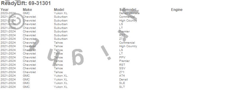 Below is an abbreviated list of applications for the SST Lift Kit.Suburban, Tahoe, Yukon XL, Chevrolet, GMC, 2025, 2024, 2023, 2022, 2021