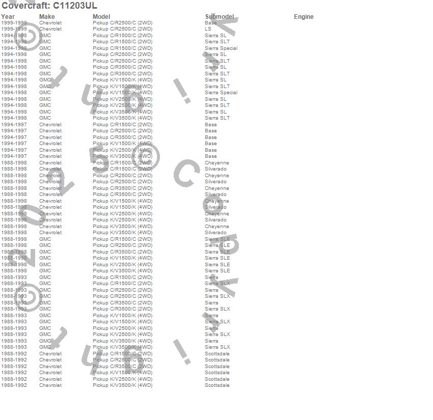 Below is an abbreviated list of applications for the Custom Fit Cab Cover.C1500 Pickup, C2500 Pickup, C3500 Pickup, K1500, K1500 Pickup, K2500 Pickup, K3500 Pickup, Chevrolet, GMC, 1999, 1998, 1997, 1996, 1995, 1994, 1993, 1992, 1991, 1990, 1989