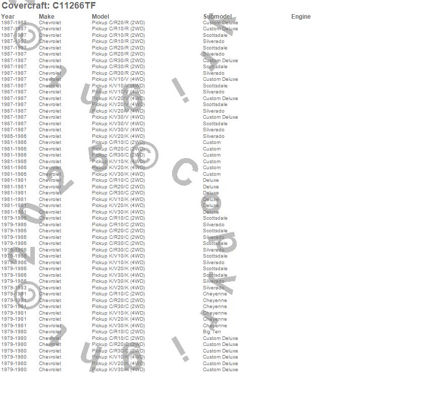 Below is an abbreviated list of applications for the Custom Fit Cab Cover.C10 Pickup, C20 Pickup, C30 Pickup, K10 Pickup, K20 Pickup, K30 Pickup, R10 Pickup, R20 Pickup, R30 Pickup, V10 Pickup, V20 Pickup, V30 Pickup, Chevrolet, 1988, 1987, 1986, 1985, 1984, 1983, 1982