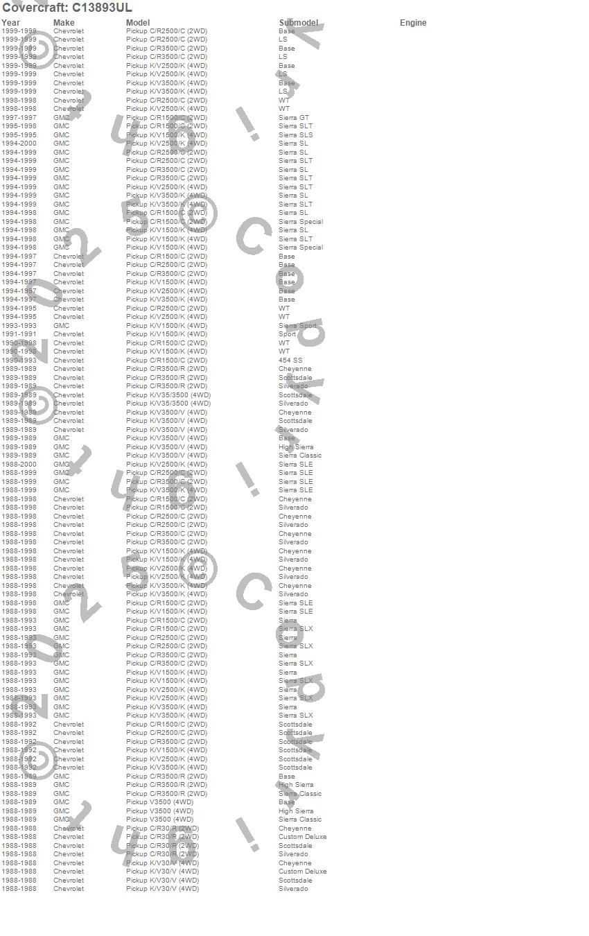 Below is an abbreviated list of applications for the Custom Fit Cab Cover.C1500 Pickup, C2500 Pickup, C3500 Pickup, K1500, K1500 Pickup, K2500 Pickup, K3500 Pickup, R30 Pickup, R3500 Pickup, V30 Pickup, V3500 Pickup, Chevrolet, GMC, 2000, 1999, 1998, 1997, 1996, 1995, 1994