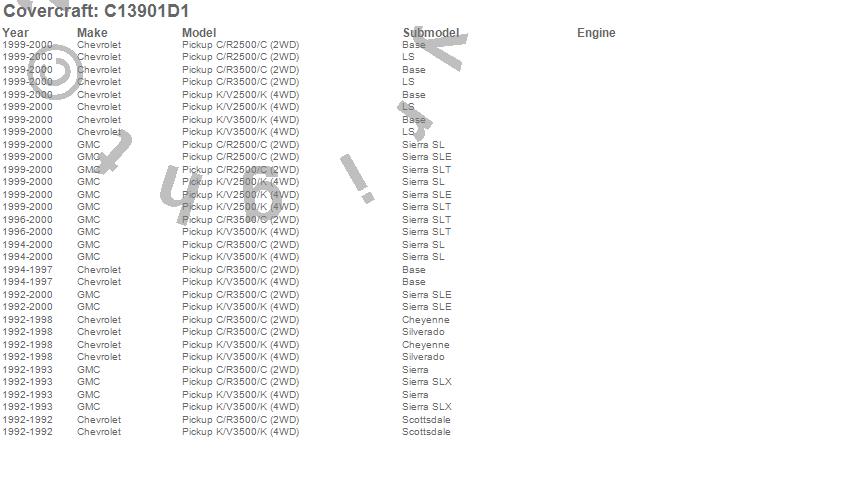 Below is an abbreviated list of applications for the Custom Fit Cab Cover.C2500 Pickup, C3500 Pickup, K2500 Pickup, K3500 Pickup, Chevrolet, GMC, 2000, 1999, 1998, 1997, 1996, 1995, 1994, 1993, 1992