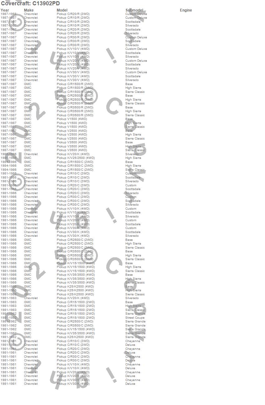 Below is an abbreviated list of applications for the Custom Fit Cab Cover.C10 Pickup, C1500 Pickup, C20 Pickup, C2500 Pickup, C30 Pickup, C3500 Pickup, K10 Pickup, K1500 Pickup, K20 Pickup, K2500 Pickup, K30 Pickup, K3500 Pickup, R10 Pickup, R1500 Pickup, R20 Pickup, R2500 Pickup, R30 Pickup, R3500 Pickup, V10 Pickup, V1500 Pickup