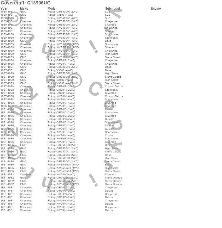 Below is an abbreviated list of applications for the Custom Fit Cab Cover.C20 Pickup, C2500 Pickup, C30 Pickup, C3500 Pickup, K20 Pickup, K30 Pickup, K3500 Pickup, R30 Pickup, R3500 Pickup, V30 Pickup, V3500 Pickup, Chevrolet, GMC, 1991, 1990, 1989, 1988, 1987, 1986, 1985