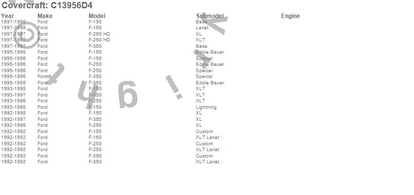 Below is an abbreviated list of applications for the Custom Fit Cab Cover.F-150, F-250, F-250 HD, F-350, Ford, 1998, 1997, 1996, 1995, 1994, 1993, 1992