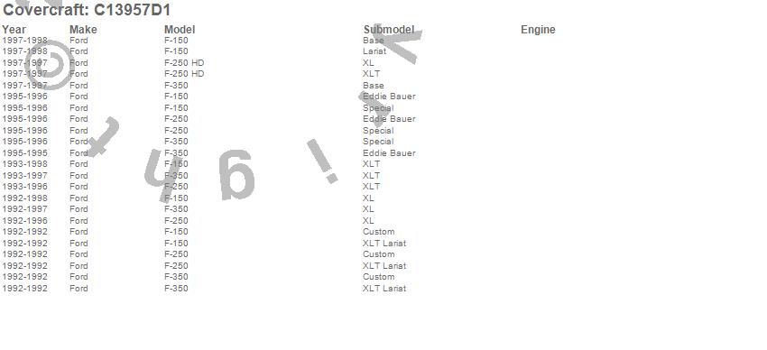 Below is an abbreviated list of applications for the Custom Fit Cab Cover.F-150, F-250, F-250 HD, F-350, Ford, 1998, 1997, 1996, 1995, 1994, 1993, 1992
