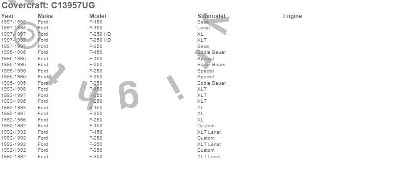 Below is an abbreviated list of applications for the Custom Fit Cab Cover.F-150, F-250, F-250 HD, F-350, Ford, 1998, 1997, 1996, 1995, 1994, 1993, 1992