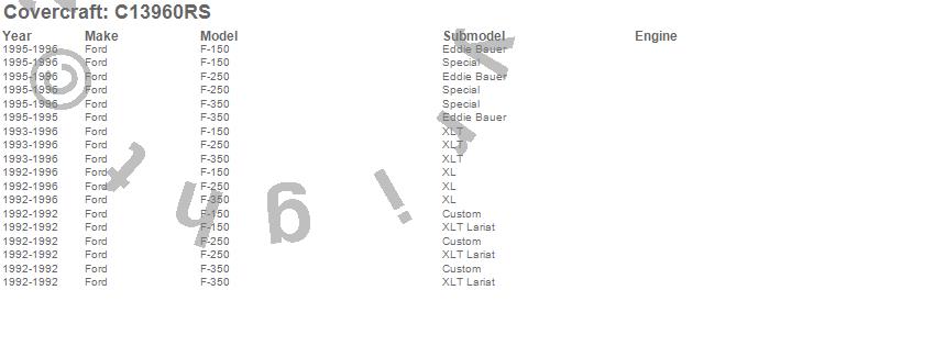 Below is an abbreviated list of applications for the Custom Fit Cab Cover.F-150, F-250, F-350, Ford, 1996, 1995, 1994, 1993, 1992
