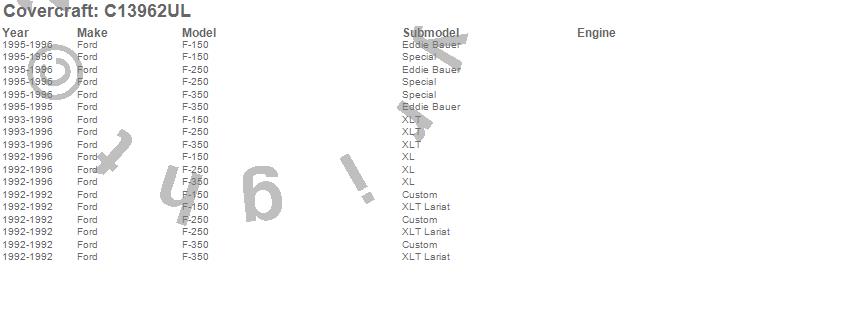Below is an abbreviated list of applications for the Custom Fit Cab Cover.F-150, F-250, F-350, Ford, 1996, 1995, 1994, 1993, 1992