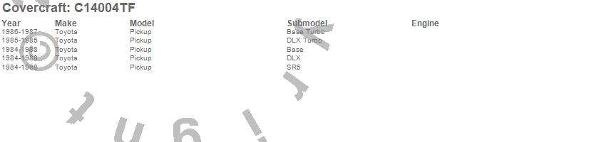 Below is an abbreviated list of applications for the Custom Fit Cab Cover.Pickup, Toyota, 1988, 1987, 1986, 1985, 1984