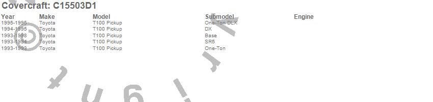 Below is an abbreviated list of applications for the Custom Fit Cab Cover.T100 Pickup, Toyota, 1998, 1997, 1996, 1995, 1994, 1993