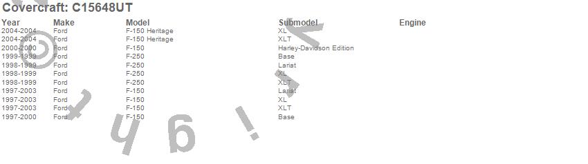Below is an abbreviated list of applications for the Custom Fit Cab Cover.F-150, F-150 Heritage, F-250, Ford, 2004, 2003, 2002, 2001, 2000, 1999, 1998, 1997