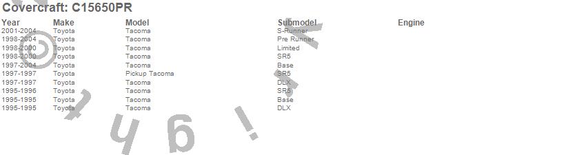 Below is an abbreviated list of applications for the Custom Fit Cab Cover.Tacoma, Toyota, 2004, 2003, 2002, 2001, 2000, 1999, 1998, 1997, 1996, 1995