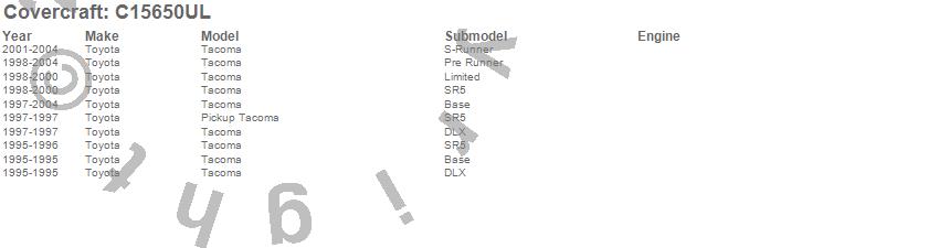 Below is an abbreviated list of applications for the Custom Fit Cab Cover.Tacoma, Toyota, 2004, 2003, 2002, 2001, 2000, 1999, 1998, 1997, 1996, 1995