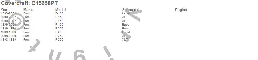 Below is an abbreviated list of applications for the Custom Fit Cab Cover.F-150, F-250, Ford, 2002, 2001, 2000, 1999, 1998