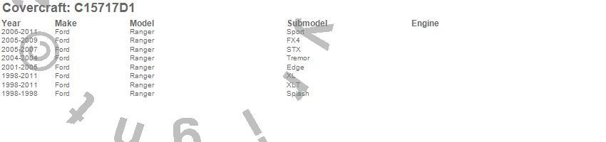 Below is an abbreviated list of applications for the Custom Fit Cab Cover.Ranger, Ford, 2011, 2010, 2009, 2008, 2007, 2006, 2005, 2004, 2003, 2002, 2001, 2000, 1999, 1998