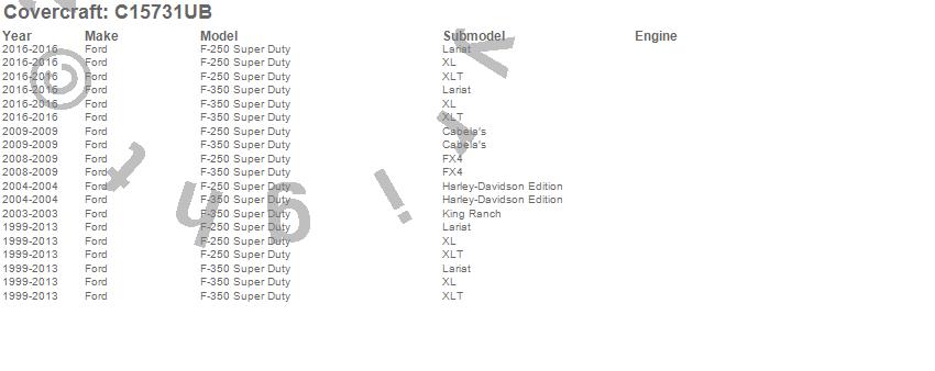 Below is an abbreviated list of applications for the Custom Fit Cab Cover.F-250 Super Duty, F-350 Super Duty, Ford, 2016, 2013, 2012, 2011, 2010, 2009, 2008, 2007, 2006, 2005, 2004, 2003, 2002, 2001, 2000, 1999