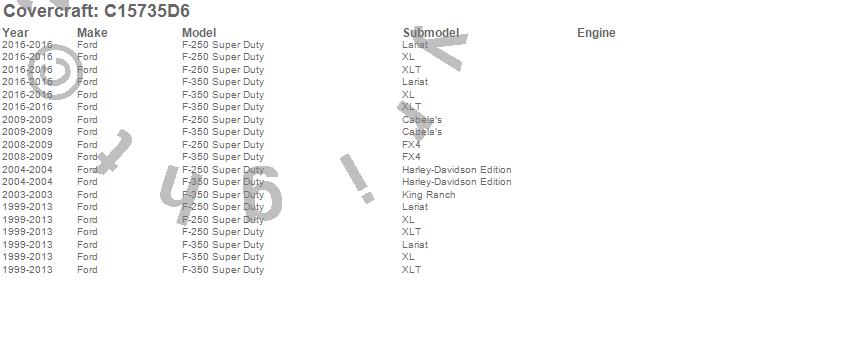 Below is an abbreviated list of applications for the Custom Fit Cab Cover.F-250 Super Duty, F-350 Super Duty, Ford, 2016, 2013, 2012, 2011, 2010, 2009, 2008, 2007, 2006, 2005, 2004, 2003, 2002, 2001, 2000, 1999