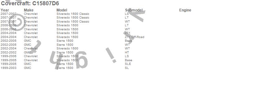 Below is an abbreviated list of applications for the Custom Fit Cab Cover.Sierra 1500, Silverado 1500, Silverado 1500 Classic, Chevrolet, GMC, 2007, 2006, 2005, 2004, 2003, 2002, 2001, 2000, 1999