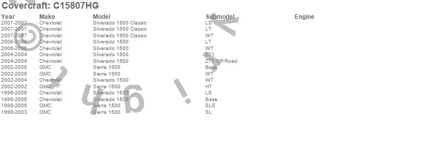 Below is an abbreviated list of applications for the Custom Fit Cab Cover.Sierra 1500, Silverado 1500, Silverado 1500 Classic, Chevrolet, GMC, 2007, 2006, 2005, 2004, 2003, 2002, 2001, 2000, 1999
