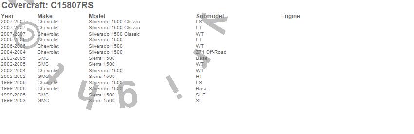 Below is an abbreviated list of applications for the Custom Fit Cab Cover.Sierra 1500, Silverado 1500, Silverado 1500 Classic, Chevrolet, GMC, 2007, 2006, 2005, 2004, 2003, 2002, 2001, 2000, 1999