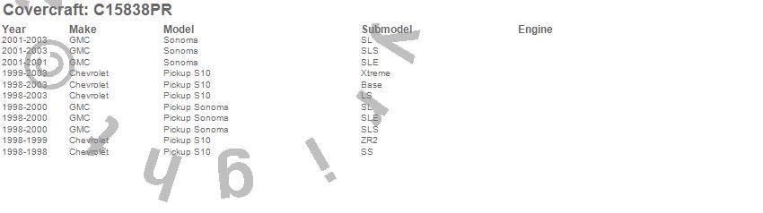 Below is an abbreviated list of applications for the Custom Fit Cab Cover.S10 Pickup, Sonoma, Chevrolet, GMC, 2003, 2002, 2001, 2000, 1999, 1998