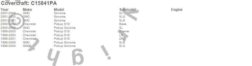 Below is an abbreviated list of applications for the Custom Fit Cab Cover.S10 Pickup, Sonoma, Chevrolet, GMC, 2003, 2002, 2001, 2000, 1999, 1998