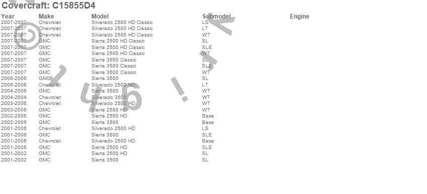 Below is an abbreviated list of applications for the Custom Fit Cab Cover.Sierra 2500 HD, Sierra 2500 HD Classic, Sierra 3500, Sierra 3500 Classic, Silverado 2500 HD, Silverado 2500 HD Classic, Silverado 3500, Chevrolet, GMC, 2007, 2006, 2005, 2004, 2003, 2002, 2001