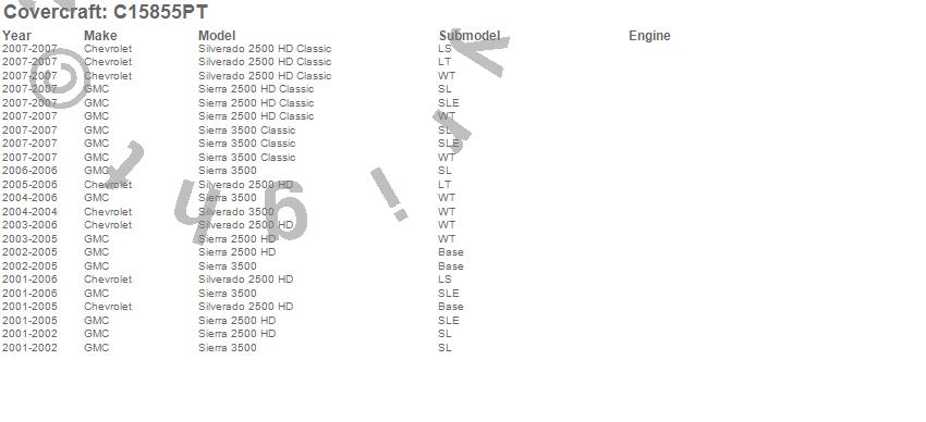 Below is an abbreviated list of applications for the Custom Fit Cab Cover.Sierra 2500 HD, Sierra 2500 HD Classic, Sierra 3500, Sierra 3500 Classic, Silverado 2500 HD, Silverado 2500 HD Classic, Silverado 3500, Chevrolet, GMC, 2007, 2006, 2005, 2004, 2003, 2002, 2001