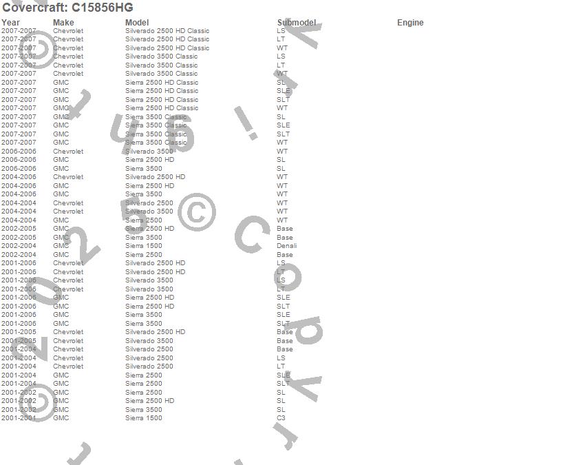 Below is an abbreviated list of applications for the Custom Fit Cab Cover.Sierra 1500, Sierra 2500, Sierra 2500 HD, Sierra 2500 HD Classic, Sierra 3500, Sierra 3500 Classic, Silverado 2500, Silverado 2500 HD, Silverado 2500 HD Classic, Silverado 3500, Silverado 3500 Classic, Chevrolet, GMC, 2007, 2006, 2005, 2004, 2003, 2002, 2001
