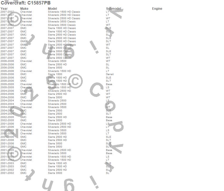 Below is an abbreviated list of applications for the Custom Fit Cab Cover.Sierra 1500, Sierra 1500 HD, Sierra 1500 HD Classic, Sierra 2500, Sierra 2500 HD, Sierra 2500 HD Classic, Sierra 3500, Sierra 3500 Classic, Silverado 1500 HD, Silverado 1500 HD Classic, Silverado 2500, Silverado 2500 HD, Silverado 2500 HD Classic, Silverado 3500, Silverado 3500 Classic, Chevrolet, GMC, 2007, 2006, 2005