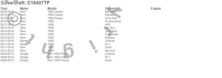 Below is an abbreviated list of applications for the Custom Fit Cab Cover.1500, 1500 Classic, Ram 1500, Dodge, Ram, 2019, 2018, 2017, 2016, 2015, 2014, 2013, 2012, 2011, 2010, 2009