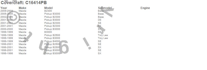 Below is an abbreviated list of applications for the Custom Fit Cab Cover.B2300, B2500, B3000, B4000, Mazda, 2009, 2008, 2007, 2006, 2005, 2004, 2003, 2002, 2001, 2000, 1999, 1998