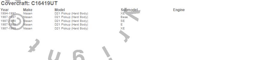 Below is an abbreviated list of applications for the Custom Fit Cab Cover.D21 Pickup (Hard Body), Nissan, 1997, 1996, 1995, 1994, 1993, 1992, 1991, 1990, 1989, 1988, 1987