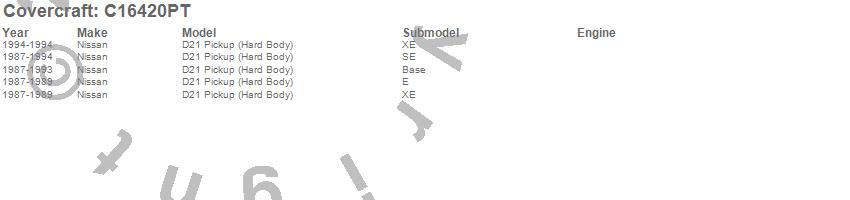 Below is an abbreviated list of applications for the Custom Fit Cab Cover.D21 Pickup (Hard Body), Nissan, 1994, 1993, 1992, 1991, 1990, 1989, 1988, 1987