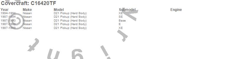 Below is an abbreviated list of applications for the Custom Fit Cab Cover.D21 Pickup (Hard Body), Nissan, 1994, 1993, 1992, 1991, 1990, 1989, 1988, 1987