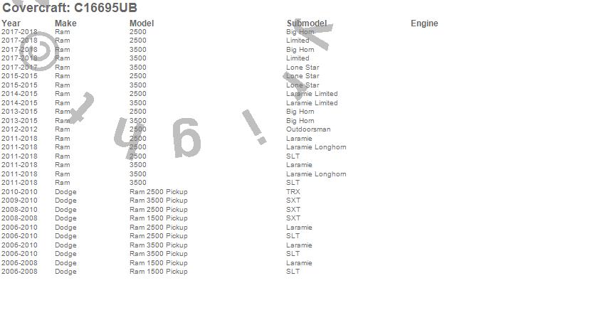 Below is an abbreviated list of applications for the Custom Fit Cab Cover.2500, 3500, Ram 1500, Ram 2500, Ram 3500, Dodge, Ram, 2018, 2017, 2016, 2015, 2014, 2013, 2012, 2011, 2010, 2009, 2008, 2007, 2006